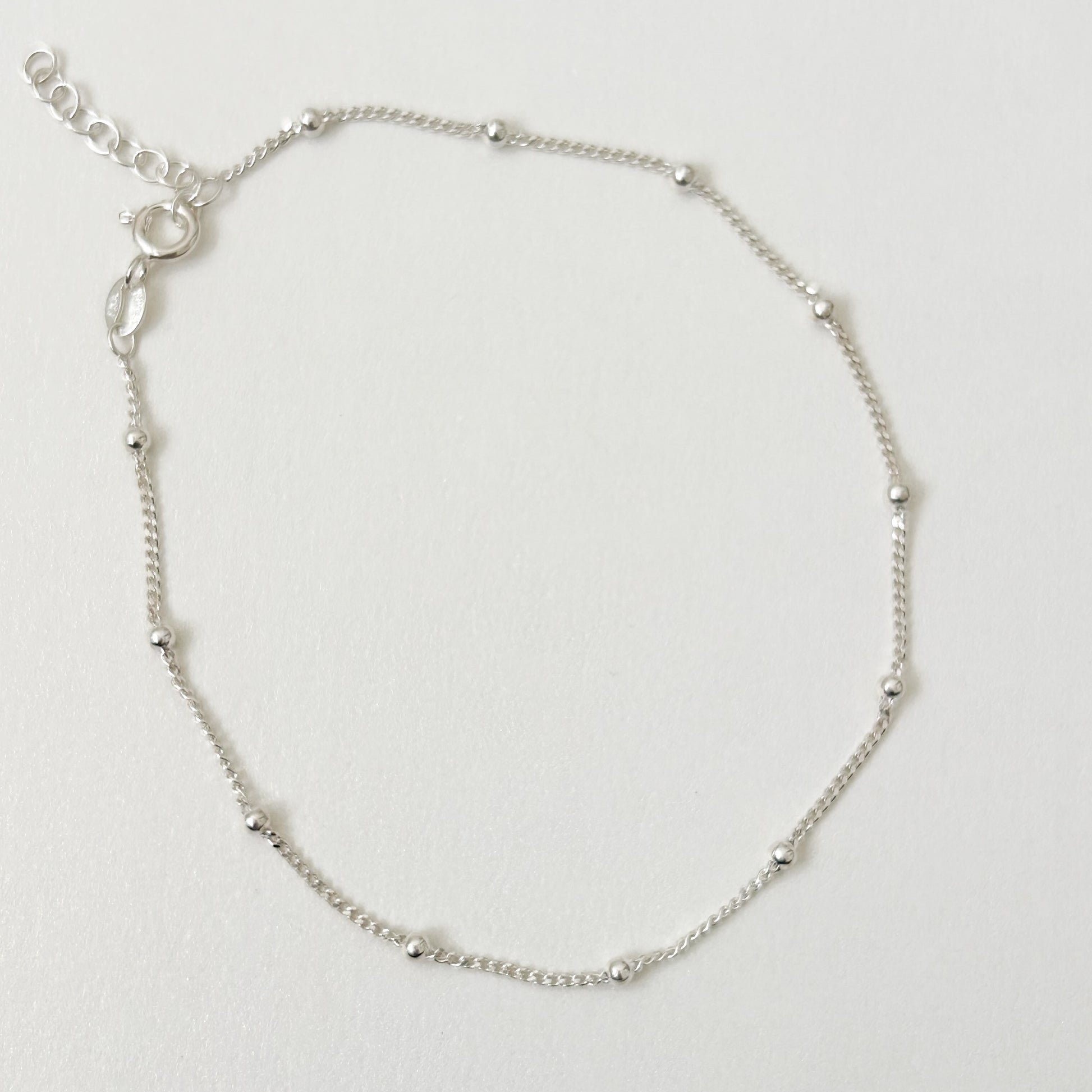 Delicate and timeless, the Silver Satellite Anklet features a fine sterling silver chain accented with subtle bead details. Designed to sit lightly at the ankle, it adds an effortless touch of shine to everyday wear.